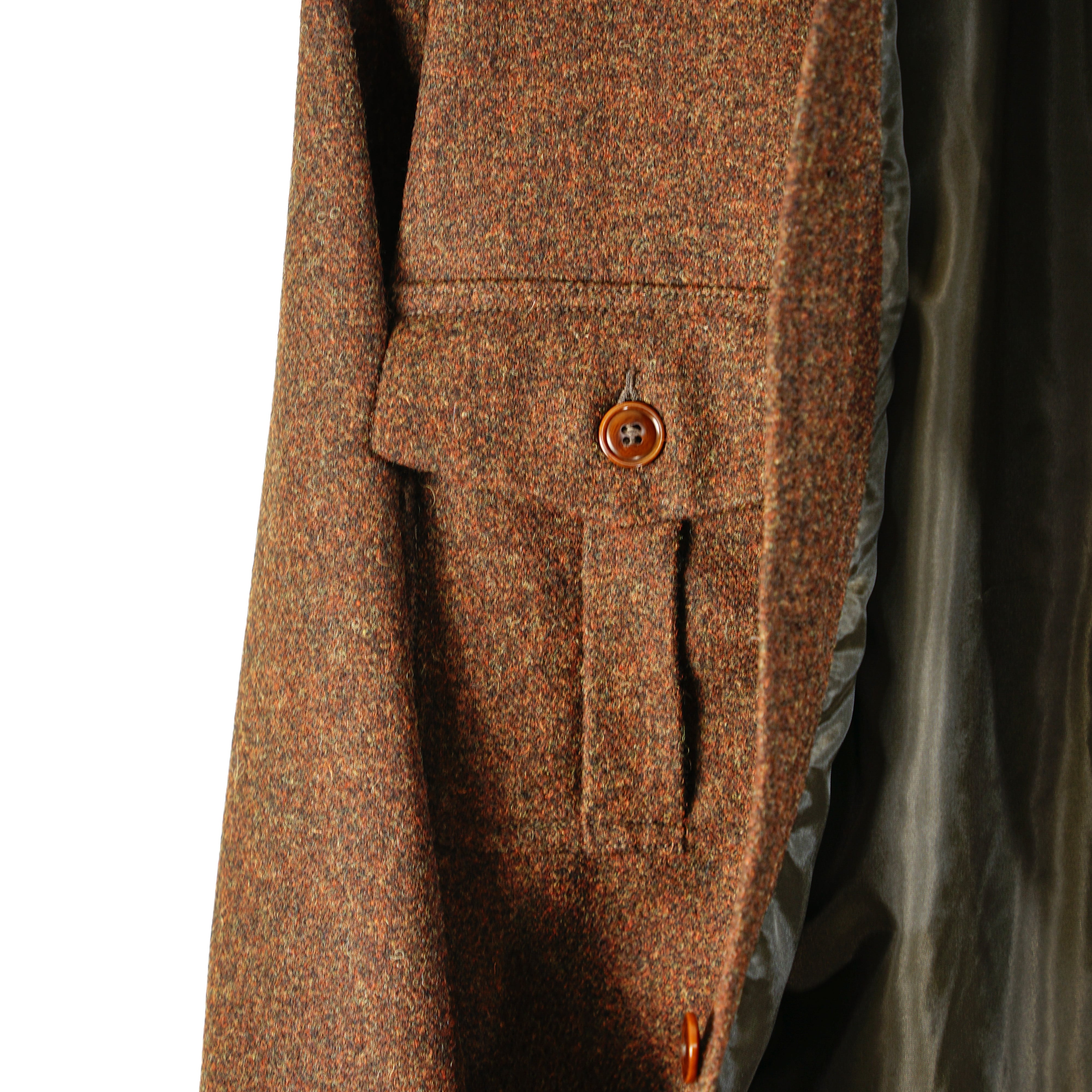 イギリス原産の羊で、黒い顔と足に白い体毛が特徴のイギリス羊毛、サフォーク種のウール糸を使用。 糸に膨らみと厚み、暖かさを持ち合わせております。さらにメリノウールを混紡させることで、上品さと柔らかさが加わりました。6種類の色毛をブレンドすることで奥深い色に仕上げた高級British Wool Tweedを使用し制作。 裏地には静電気を防止する加工を施し、重ね着の際にも快適に着用できます。
